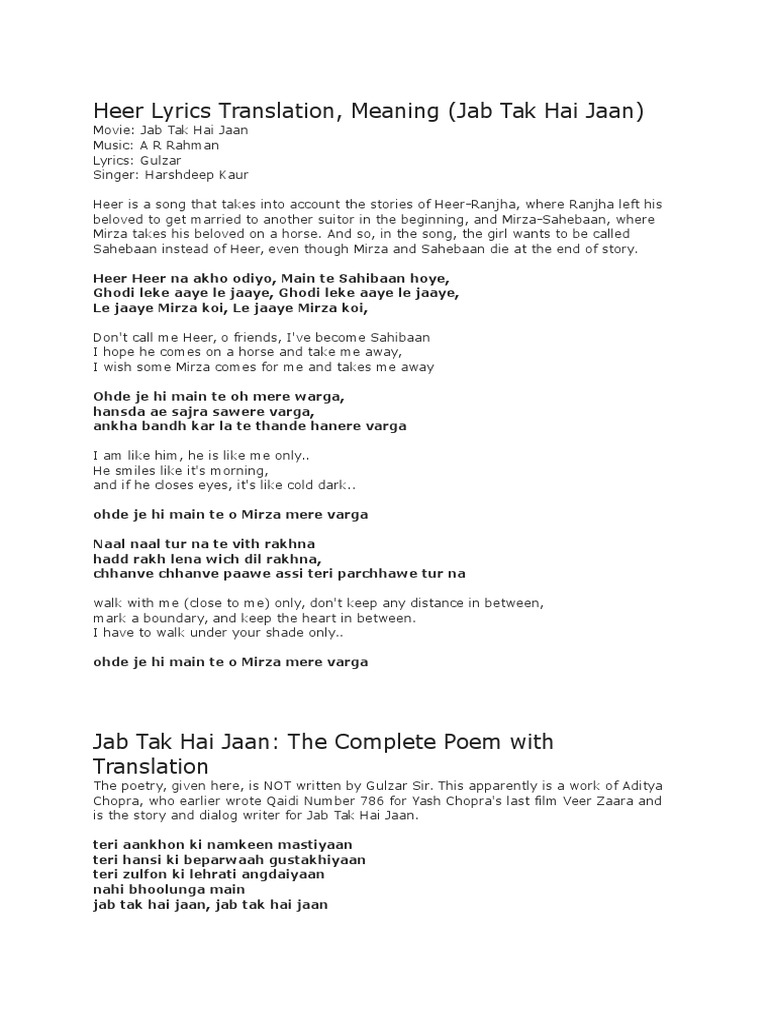 Heer Lyrics Translation Cinema Of India Bollywood Challa, saans, jiya re vb.